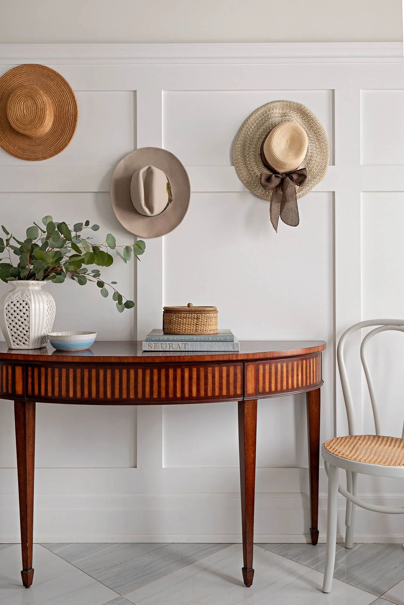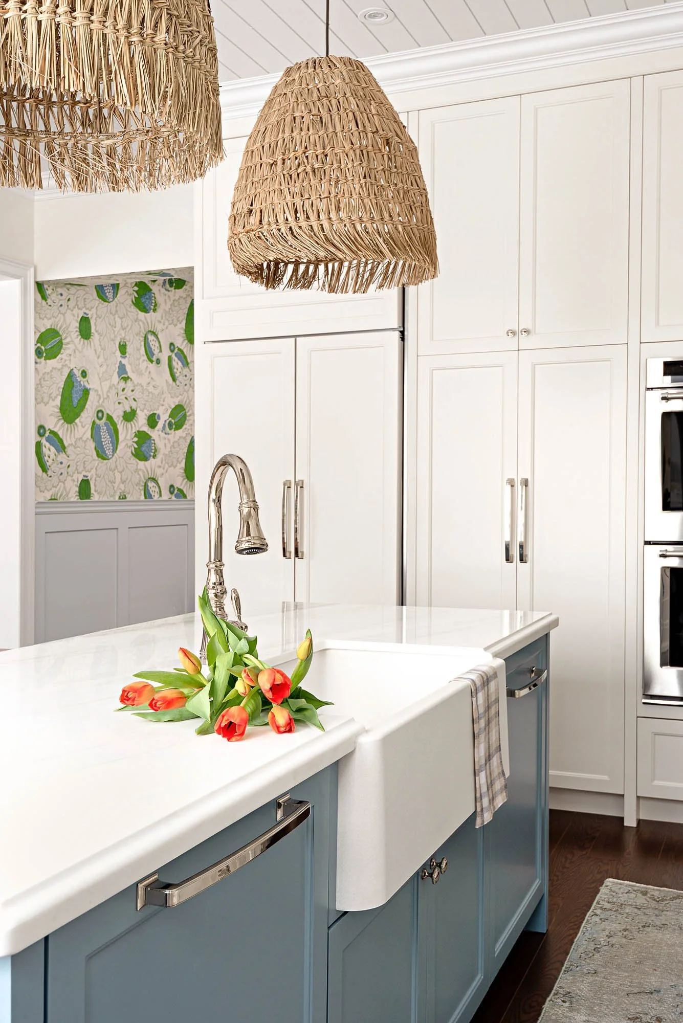 We designed this Oakville home from the ground up, working with the client to select every architectural detail and finish. The client wanted a home that felt classic and casual but elevated. We infused lots of texture with wallcoverings and custom drapery to create an inviting atmosphere and found great furniture gems at vintage stores to bring an element of history to this brand-new build.